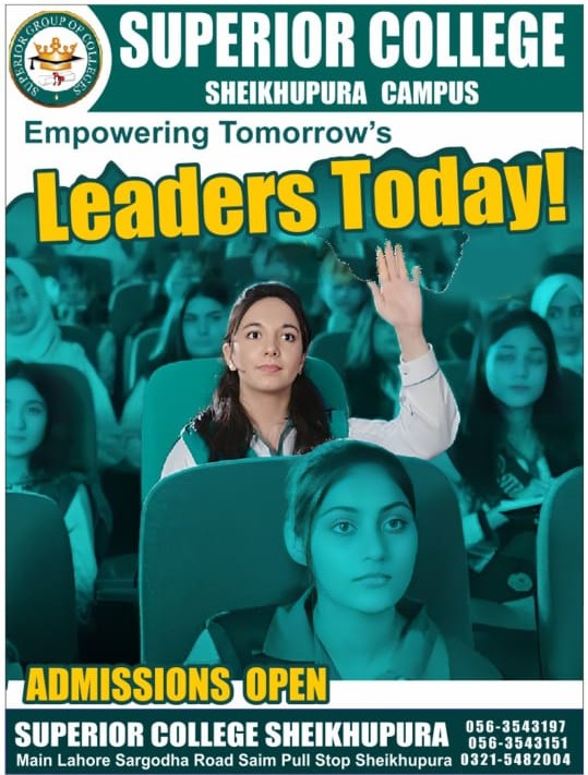 Superior College Sheikhupura is a modern, purpose-built campus providing quality education in a fully air-conditioned environment. Located near Lahore, the city is known for its rich agriculture and historic Mughal-era sites like Sheikhupura Fort and Hiran Minar. Affiliated with BISE Lahore, the college offers well-equipped science and computer labs, ensuring practical learning. Additionally, it now offers BS programs in affiliation with GC University Faisalabad, providing research-driven education and industry-relevant skills. With a strong focus on academics, co-curricular, and extra-curricular activities, Superior College Sheikhupura nurtures confident, well-rounded individuals ready for professional success.